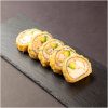 Krabí tyčinka, tuňák, tavený sýr, avokádo, pečené v tempuře v tempuře; guacamole, teriyaki, pink a majonéza wasabi omáčka